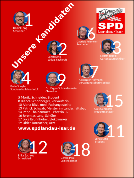 Willkommen beim SPD-Ortsverein Landau an der Isar Die SPD in Landau hat Tradition. Seit über 100 Jahren besteht der Ortsverein Landau der Sozialdemokratischen Partei Deutschlands. In diesen Jahren hat sich viel verändert, aber die Ziele und die Menschen die diese Ziele verwirklichen wollen nicht. Wir stehen immer noch für eine soziale und gerechte Politik. Wir wollen, dass sich jeder Bürger in unserer Stadt wohlfühlt und seinen Beitrag zur Gestaltung unserer Stadt leisten kann. Wir wollen eine sichere Zukunft für unsere Kinder und einen ruhigen und angenehmen Lebensabend für unsere Senioren. Wir wollen, dass Landau eine wirtschaftlich starke, kulturell attraktive und sportlich erfolgreiche Kommune bleibt und wird. Dafür setzen wir uns ein. Mit Herz und Verstand für Stadt und Land. Ihre SPD in Landau an der Isar